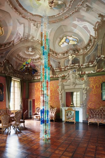 Allestendo la facciata del Museo Vorarlberg con una grande varietà di stampi realizzati con i fondi di bottiglie PET, l’artista altoatesino Manfred Alois Mayr aveva acquisito notorietà internazionale. Nella rappresentativa sala da ballo del Palazzo Castelmur con i contenitori di plastica PET, sul mercato dal 1990, ha creato una scultura sulla quale la luce proveniente da fuori crea dei giochi. Numerose bottiglie vuote di softdrink, rovesciate e incollate una sopra l’altra, si ergono in altezza a mo’ di torre e generano un’elegante e sorprendente immagine di colonna che indirizza lo sguardo verso il dipinto centrale. Il legame con il luogo specifico crea riferimenti alle molteplici pitture trompe l’œuil oppure alle sfere di vetro ornamentali per il corrimano delle scale. Accanto a un modellino di zucchero della pasticceria «Castelmuro» l’artista abbozza un quadro della storia dei pasticceri bregagliotti, intrecciata strettamente alla globalizzazione.