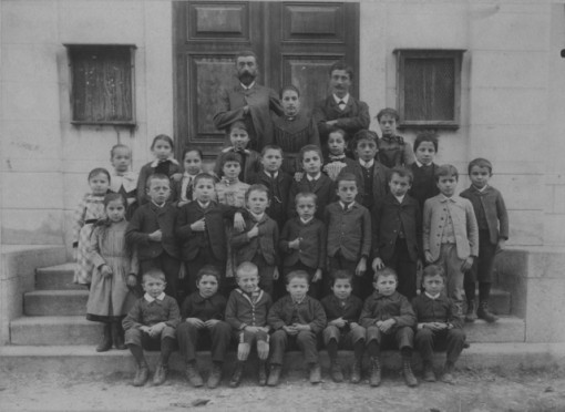 La scolaresca di Castasegna. In alto a sinistra: Gaudenz Giovanoli - Mani (fra gli scolari Andrea e Margherita Garbald). Anno scolastico 1891-92. Fotografo: Anton Reinhardt, St. Moritz