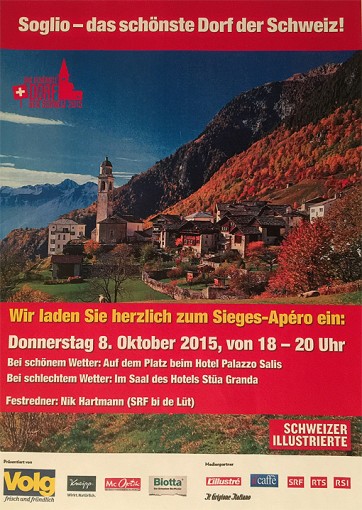 La gente di Soglio è invitata all’aperitivo per i festeggiamenti del più bel villaggio della Svizzera. Giovedì, 8 ottobre 2015.