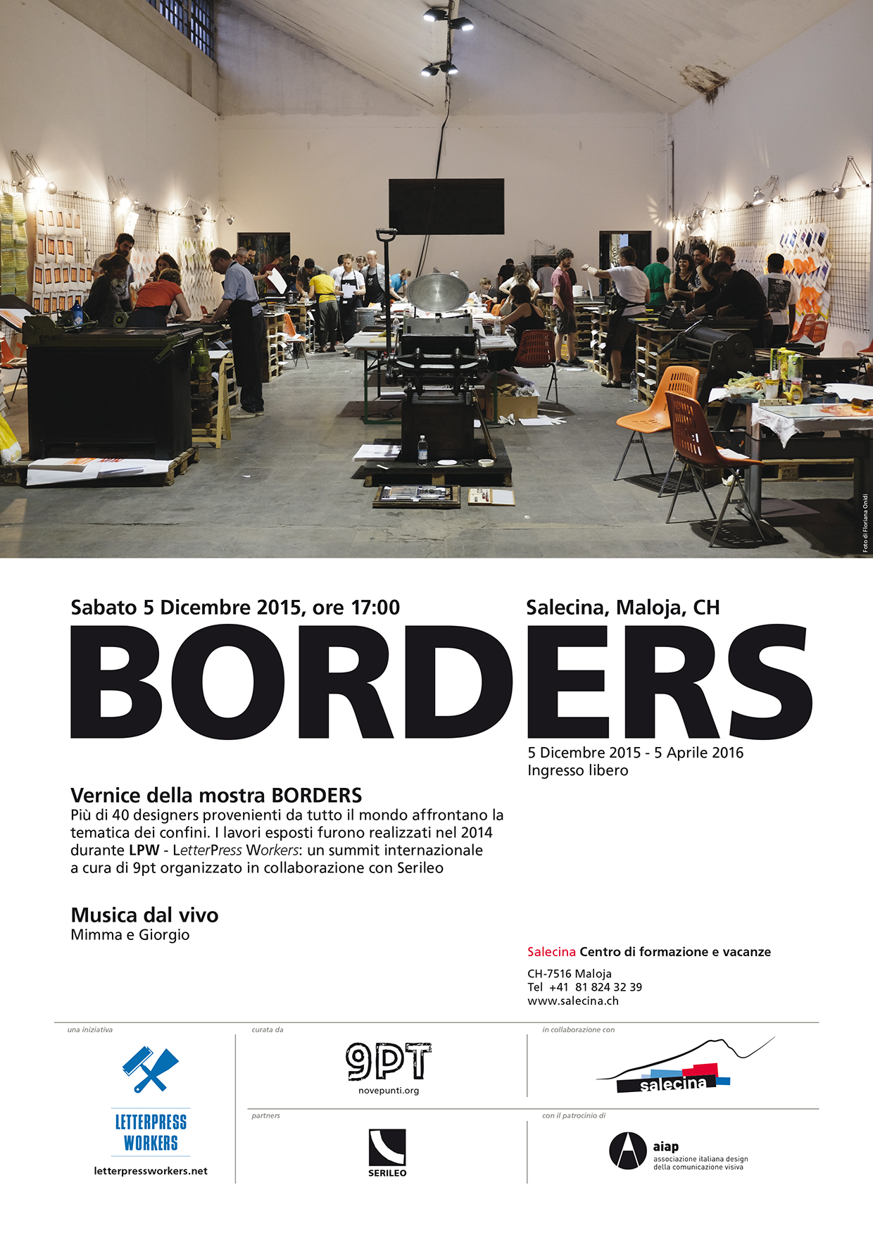 Sabato 5 dicembre 2015 alle ore 17.00 a Salecina, Maloja si inaugurerà, con aperitivo e musica, l’esposizione “Borders”. La mostra è composta da circa quaranta stampe a caratteri mobili e serigrafie realizzate da più di venticinque designer provenienti da Europa e America Latina.