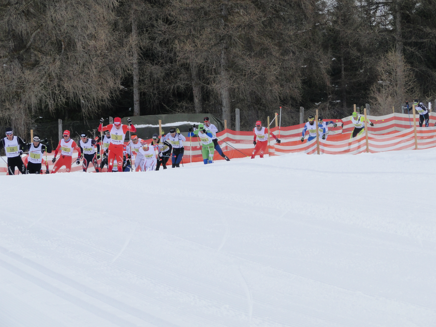 Il gruppo di testa all'uscita dal ponte. Lo sciatore con il n. 18 è Roman Furger, che vincerà. Al suo fianco il n. 1 Dario Cologna, con il bastoncino sinistro rotto. Foto di Marco Ranzoni