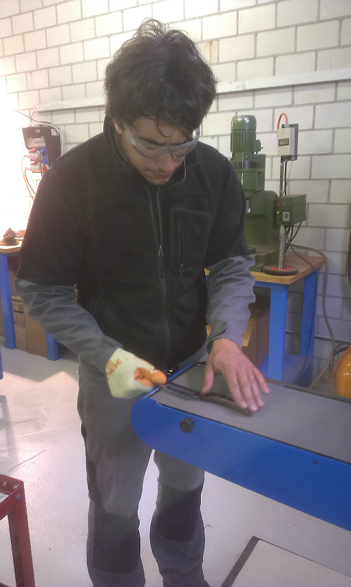 Marco Pomoni leviga il manico di un coltello al nastro abrasivo