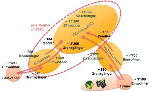 Lo schema illustra i flussi quotidiani dei lavoratori nelle aree che oggi sono le Regioni Maloja e Bernina (Einwohner = abitanti, Grenzgänger = frontalieri, Pendler = pendolari, Beschäftigte = impiegati)