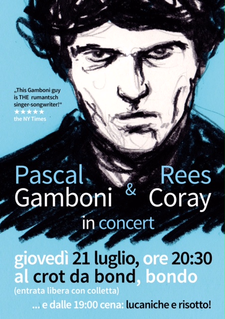 Il cantautore sursilvano Pascal Gamboni suonerà domani giovedì 21 luglio al Crot da Bond, insieme al contrabbassista Rees Coray. Un concerto a offerta libera a cui si potrà assistere a partire dalle ore 20.30 e che potrà essere preceduto da una cena a base di risotto e lucanica.