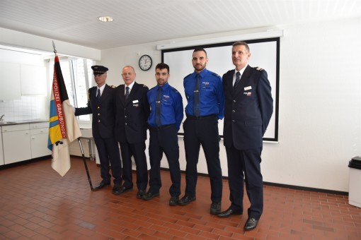 L’alfiere Gion Schmid, il responsabile regionale ovest Eduard Gabathuler, Diego Giovanoli, Kevin Darlis e il comandante Walter Schlegel (da sinistra)
