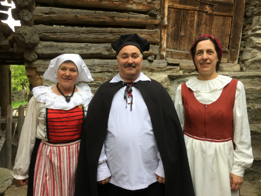 La «Compagnia Florio», che ha rappresentato una scena di teatro in strada a Soglio. Personaggi: il pastore Michel Agnolo Florio fra le due donne alle quali ha fatto visita