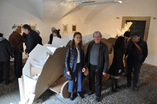Nella Rimessa Castelmur, Dora Lardelli a fianco dell'artista Hans-Ulrich Theilkäs, davanti alla sua installazione di cartone e pop corn. Sulla destra, Barbara Gabrielli, responsabile cantonale della promozione della cultura, in conversazione con Luciano Fasciati, gallerista di Coira, promotore di «Arte Albigna»