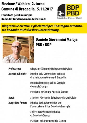 Un contributo da parte della Sezione PBD / BDP Bregaglia. Il partito borghese democratico si rallegra e si congratula con Remo Capadrutt per la brillante nomina nel municipio ringraziando gli elettori per il sostegno dato ai due candidati della nostra lista