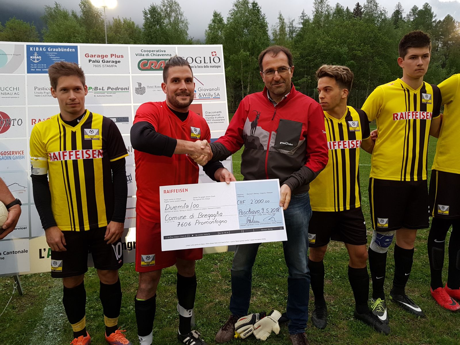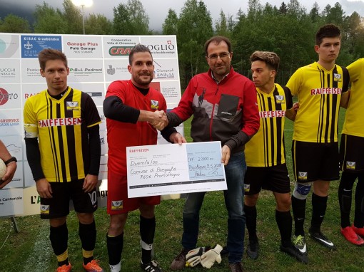 Il derby della solidarietà. In occasione del derby fra l’ACB e la VPC, Gian Luca Giovanoli assessore allo sport del Comune di Bregaglia ha ricevuto da Sandro Cirolo, direttore sportivo della Valposchiavo Calcio un assegno di Fr. 2’000.00 a favore di Bondo, ricavato dal torneo del lunedì di Pasqua di Poschiavo dove erano coinvolte, oltre alla VPC anche la filarmonica di Poschiavo e l’Associazione Poschiavina Esploratori.