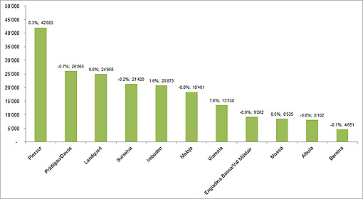 All’interno dei Grigioni, con l’1,6 per cento ciascuna le regioni Imboden e Viamala hanno fatto registrare la crescita di popolazione nettamente più elevata. Il numero di abitanti è aumentato anche nelle regioni Landquart, Moesa e Plessur, mentre nelle rimanenti sei regioni la popolazione ha subito una leggera contrazione.